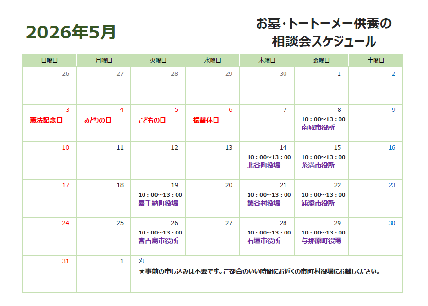 5月度、下記に記載の日程で「お墓・トートーメー供養の相談会」を