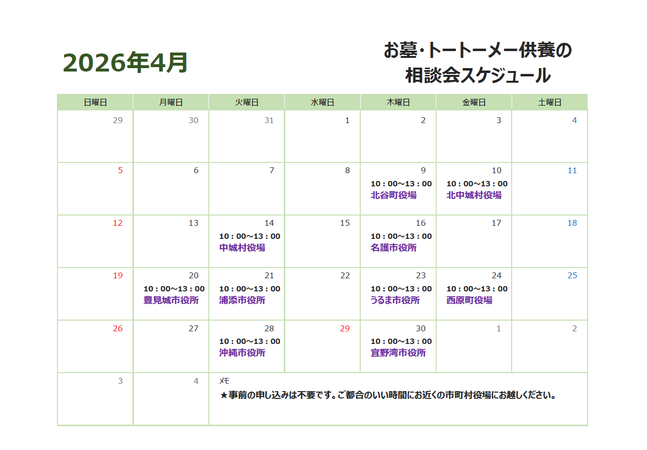 - 平素より各メモリアルパークにご愛顧を賜りありがとうございます。 4月度、下記に記載の日程...