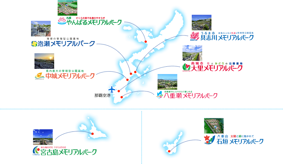 メモリアルパークは観光スポットの近くや空港から市街地までのルート沿いなど、沖縄に着いてからも便利な場所に位置しています。離島でも空港近くや市街地までの道沿いでアクセスしやすく、移動での負担を感じさせません。