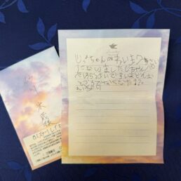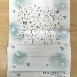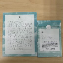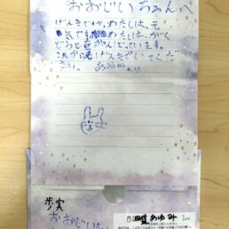 メモリアルポストとは? メモリアルポストのメッセージ メモリアルポストのメッセージ To.おおじいちゃんへ From.あゆみより げんきですか。わたしは、元 気です。わたしは、がく どうとをがんばっています。 これからもげんきでいてくだ 続きを読む To.おおじぃちゃんへ From.ちるより またぎふからおきなわ にきたよ。おおじぃちゃんは、 おげんきですか、わたし は、げんきです。よも 続きを読む To.おおじいちゃんへ From.田盛 結乃より お元気ですか。わたしは元気です。 わたしはいま、じゅくにいったり学校 にいったりがんばっています。次は 5 続きを読む To.じっちゃんへ From.れいきより れいき7さい になりました じっちゃんパ パは53さいです いまどんな ところでなくなった?? 続きを読む To.安子ばぁばぁへ From.いちか・ちから・ことはより いつも、いちかたちのことをみまもってくれ てありがとう。これからも天国でたのしく、 くらしてね!今年も、1年よろしくおねが 続きを読む To.お父さんへ From.あいりとつばさより お誕生日おめでとう 昨年の誕生日が最後だったなんて。。 でも、初まごとの誕生日を祝えて よかったのかな? 続きを読む To.大すきな お父さんへ From.ルミより 大すきな お父さんへ お父さん、今日も寒いけど、ののがあんだ マフラー なみが あんだニット帽かぶって あ 続きを読む To.ばあばとひめへ From.かえでより ばあばとひめへ かえちゃんはまたおきなわに きたよ!!おきなわにきてブルーシールアイスやこうせいととか い 続きを読む To.大すきな お父さんへ From.るみより 大すきな おとうさんへ 今日は 晴れて暑くなりそうな天気だよ。 大すきな お父さん 元気にしていますか。 続きを読む To.カズミチおじさんへ From.みきより カズミチおじいちゃんへ 私たちのことを みまもってくれてありが とうございます。 天国でも 続きを読む 1234510次のページを見る