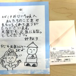メモリアルポストのメッセージ 泡瀬メモリアルパーク To.カズミチおじさんへ From.みきより カズミチおじいちゃんへ 私たちのことを みまもってくれてありが とうございます。 天国でも、元気になっててください。 みきより 前の記事を見る前へ メッセージ一覧に戻る一覧に戻る 次の記事を見る次へ